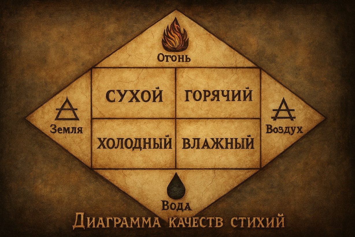 Огонь и Земля нейтральны: сухость объединяет, но направления разные — есть и плюсы (тепло нужно для урожая, угли помогают пламени гореть), и минусы (жара губит землю, избыток земли гасит пламя). Воздух и Вода также нейтральны: влажность объединяет, но они разнонаправлены — на каждый плюс есть минус. Враждующие стихии противоположны: у них нет общего фактора.
